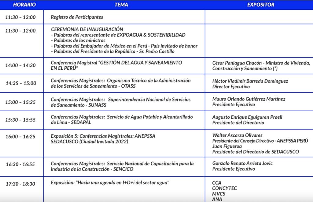Entonces, durante los tres días del evento, se llevará a cabo un programa variado y atractivo, combinando conferencias magistrales, mesas redondas, charlas comerciales, programas de articulación empresarial, capacitaciones y activaciones diversas desde temas técnicos, cultura medioambiental hasta degustaciones o experiencias. Pero no solo podrás disfrutar de lo mencionado sino también de interactuar con personas con los mismo intereses que tú. ¿Nos vemos en la Expo Agua 2022?.